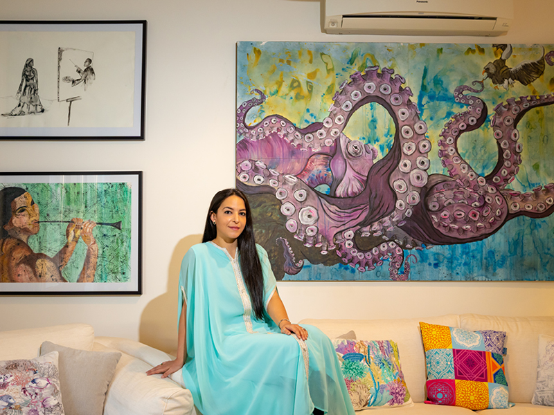 There is a pin-drop silence as you enter her beautiful villa at Al Mawaleh but within minutes you notice numerous artworks screaming for attention from different sections of her parlour. Art seems to be in the DNA of this dwelling.