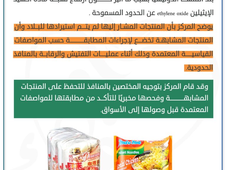 The centre has clarified that the specified product was not imported into Oman and that similar products are subject to conformity procedures, as per the approved standard specifications, during inspection and control at the border ports.